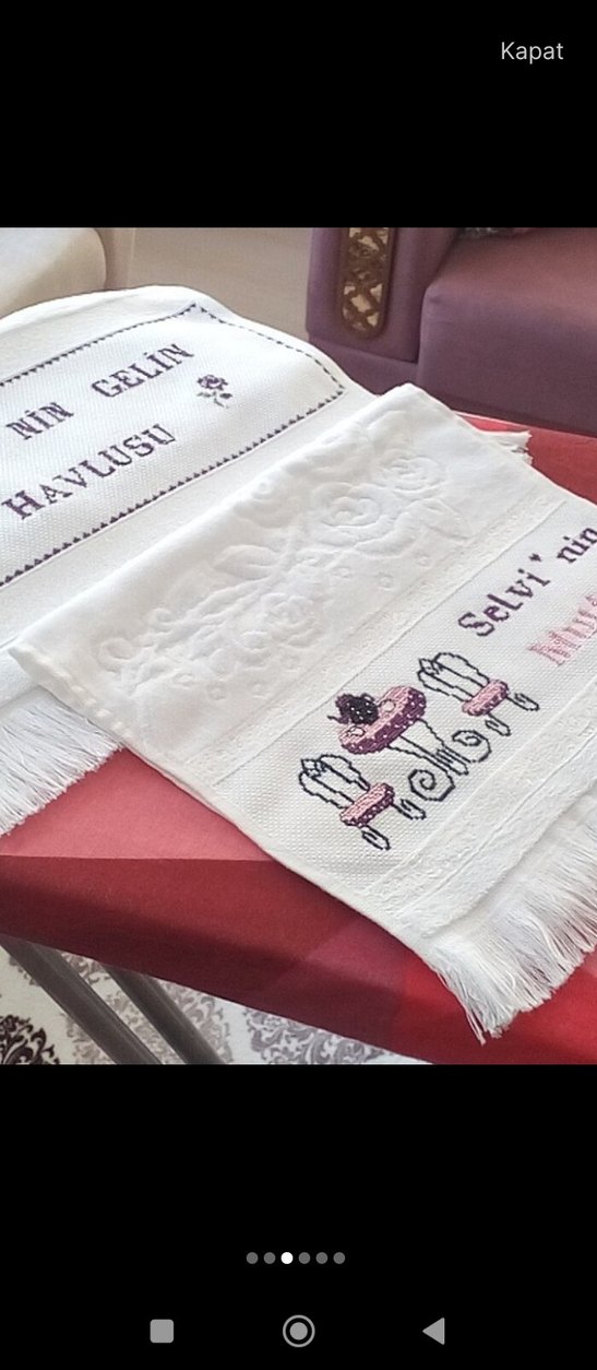 Nakışlı detaylara ve püsküllü kenarlara sahip parlak beyaz mutfak havlusu, "Selvi" ve "Gelin Havlusu" yazılarıyla kişiselleştirilmiştir. bılgı ıcın yazın