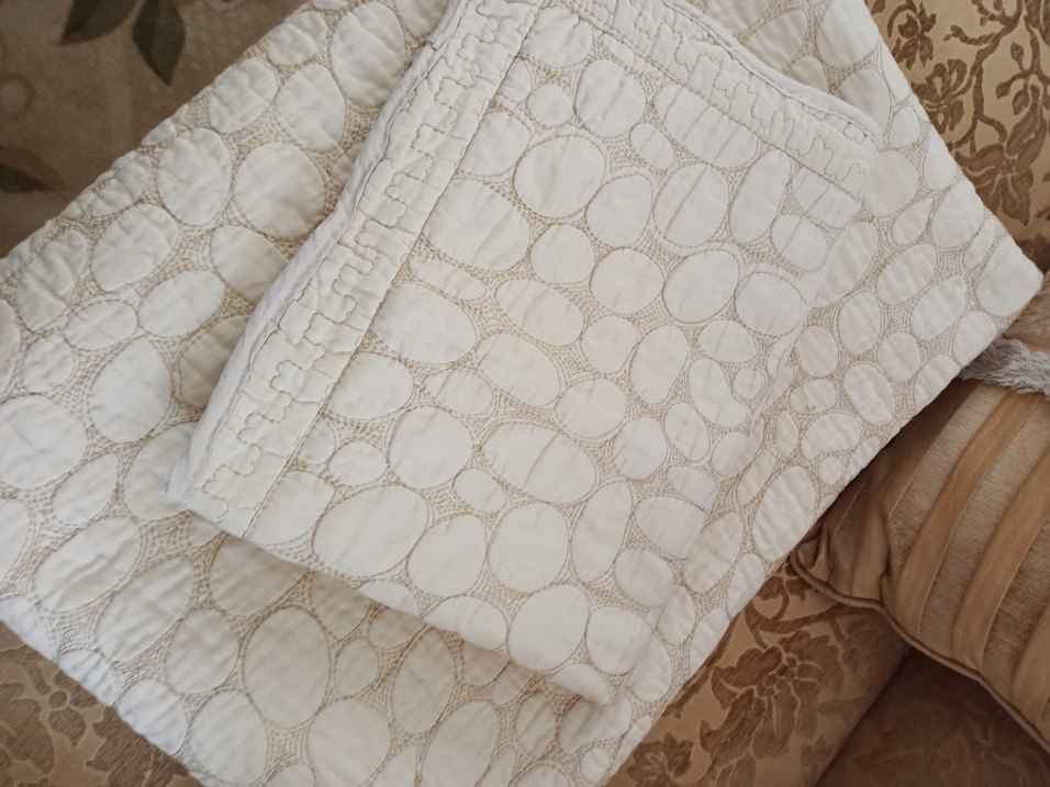 Nakışlı desenli, parlak beyaz kumaştan yapılmış yatak örtüsü, yatak odasına zarif bir dokunuş katıyor. ️