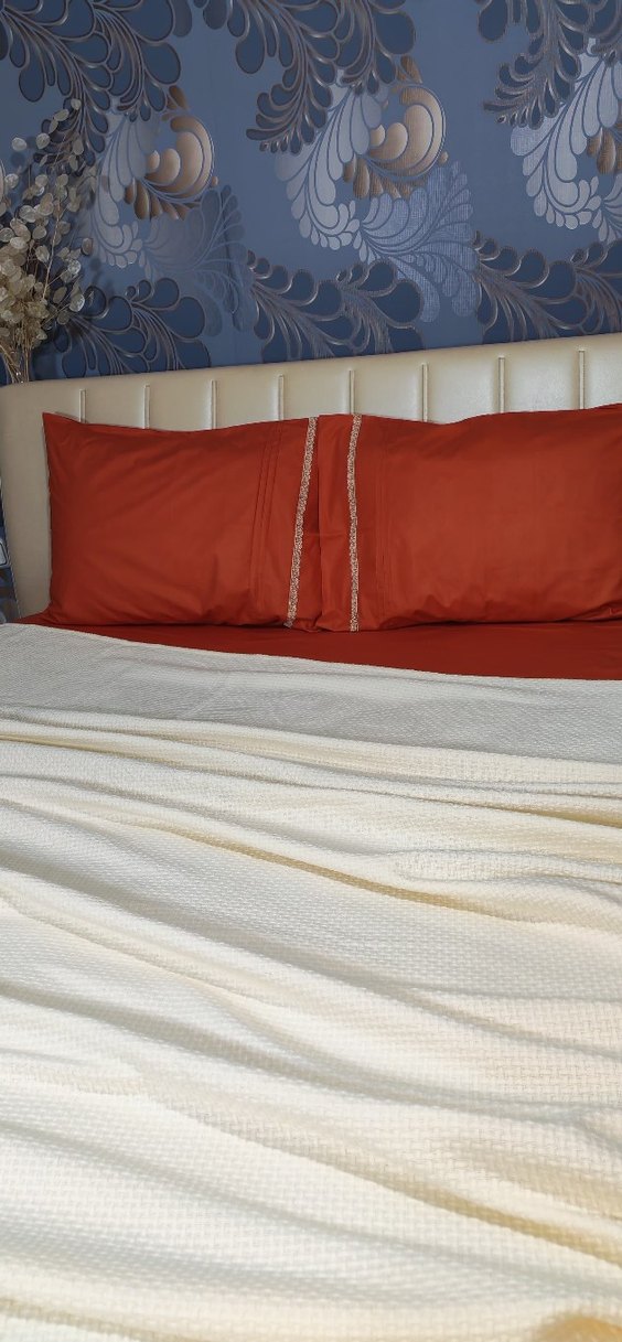 Nakışlı detaylara sahip parlak kırmızı renkli nevresim takımı, yatak odasına sıcak ve şık bir hava katıyor. ️