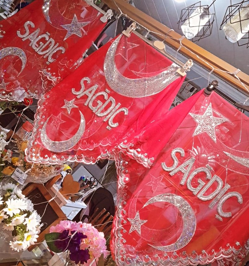Parlak kırmızı kumaş üzerine nakışlı yıldız ve hilal desenleri bulunan şal "SAGDIC" yazısı işlemelidir. ✨