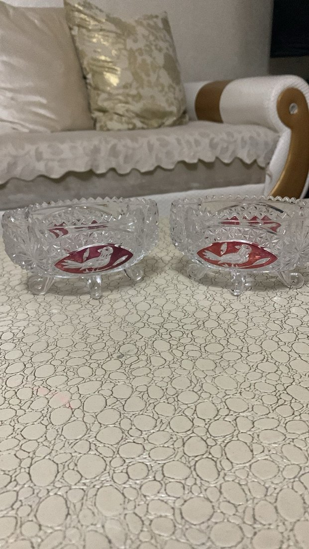Klasik tarzda, parlak kırmızı nakışlı kuş desenli, üç ayaklı cam tabaklar. ️2 tane fiyatıdır