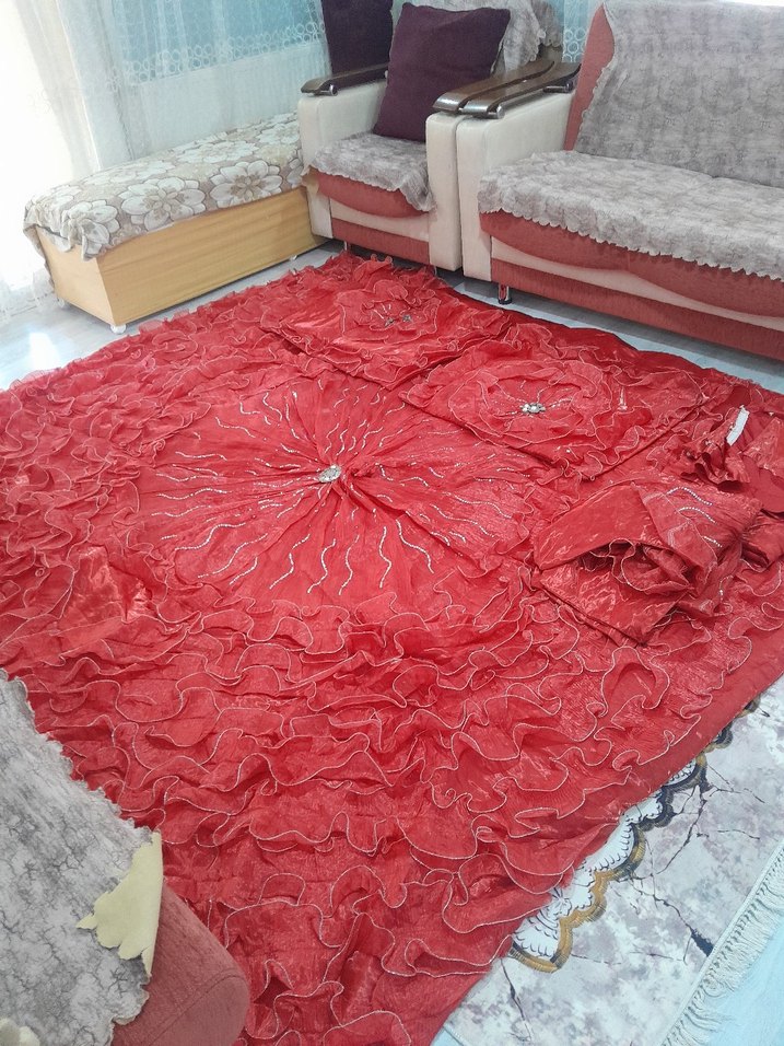 Parlak kırmızı renkte, nakış detaylı ve katmanlı fırfırlara sahip yatak örtüsü, odaya şıklık ve doku katar. ️