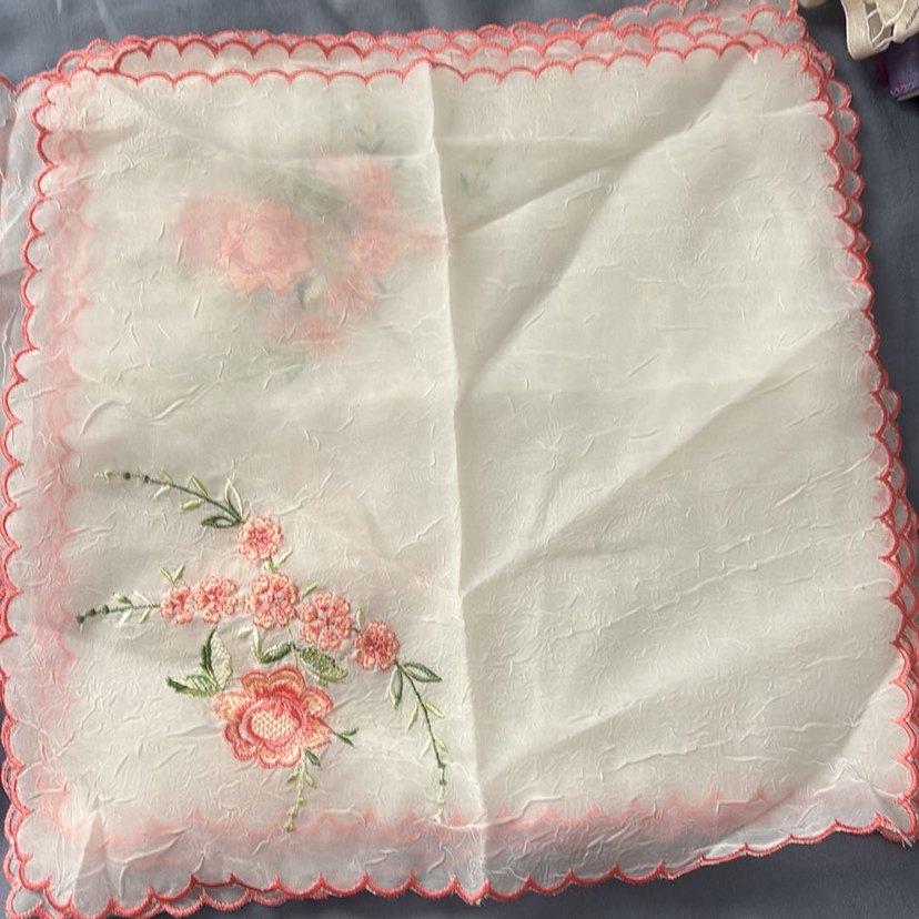 Nakışlı pastel çiçek detaylarına ve dalgalı kenarlara sahip beyaz masa örtüsü, geleneksel tarzda. 7 adettir