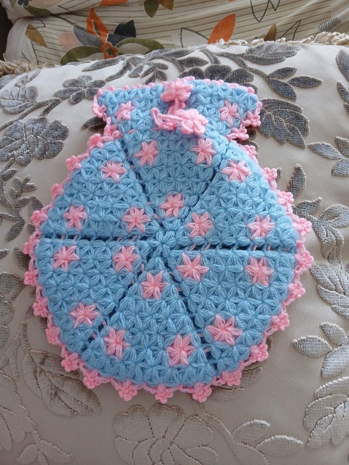 Pastel çok renkli bebek önlüğü, açık mavi zemin üzerinde pembe nakışlı yıldız desenleriyle ve ince tığ işi dokusuyla hazırlanmıştır.