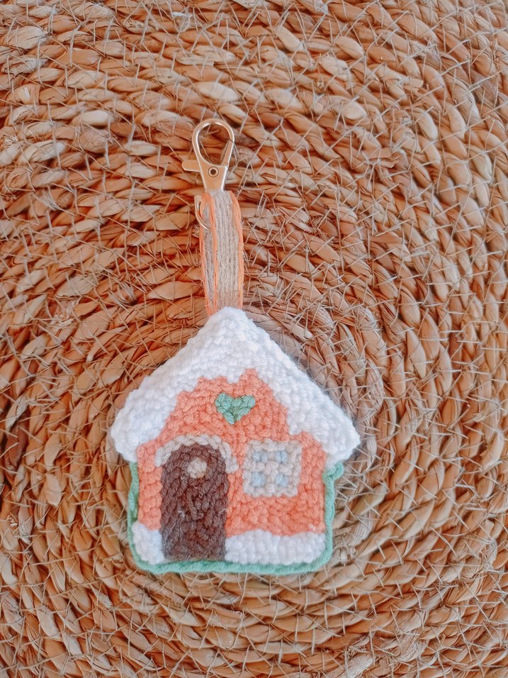 Nakışlı detaylara sahip, küçük ev şeklinde pastel kahverengi anahtarlık, kolay takma için klips içerir.