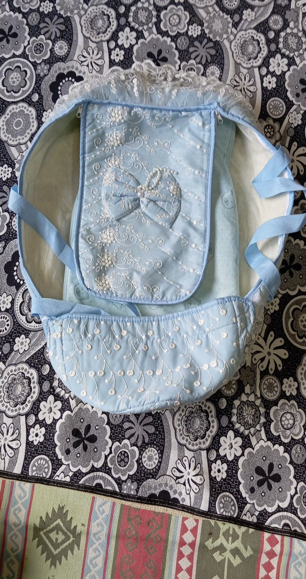 Nakışlı çiçek desenleri ve fiyonk detayıyla pastel mavi bebek çantası. Yumuşak kumaş ve ayarlanabilir askılar rahatlık sağlar. az kullanılmış minderi yok