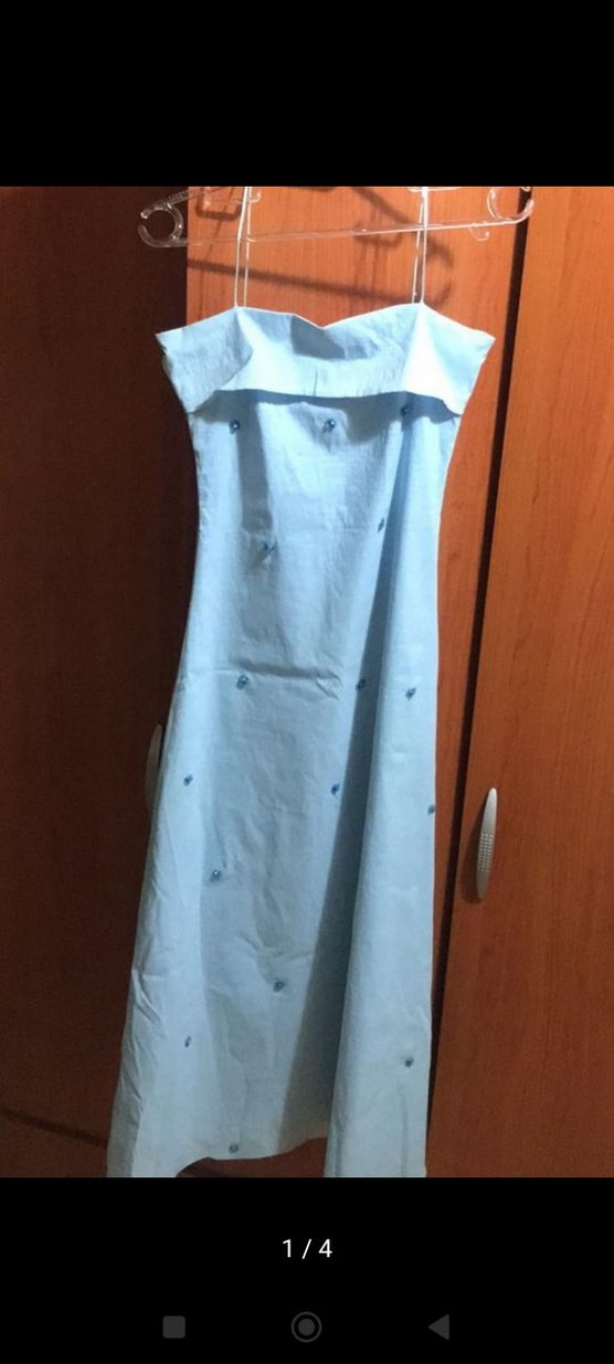 Nakışlı detaylara sahip pastel mavi elbise salıyla birlikte gönderilecek bedende 1 yazıyor ama çok dar xs