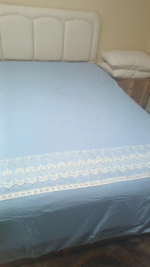 mavi yatak örtüsü, kenarında zarif nakışlı çiçek desenleri bulunur. fermuari bozuk o yüzden uyguna birakicam