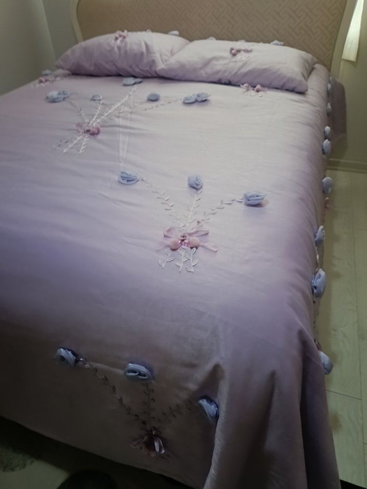 Nakışlı çiçek desenli, pastel mor yatak örtüsü ve uyumlu yastık kılıfları. Yumuşak ve şık tasarımıyla yatak odasına sıcaklık katar.