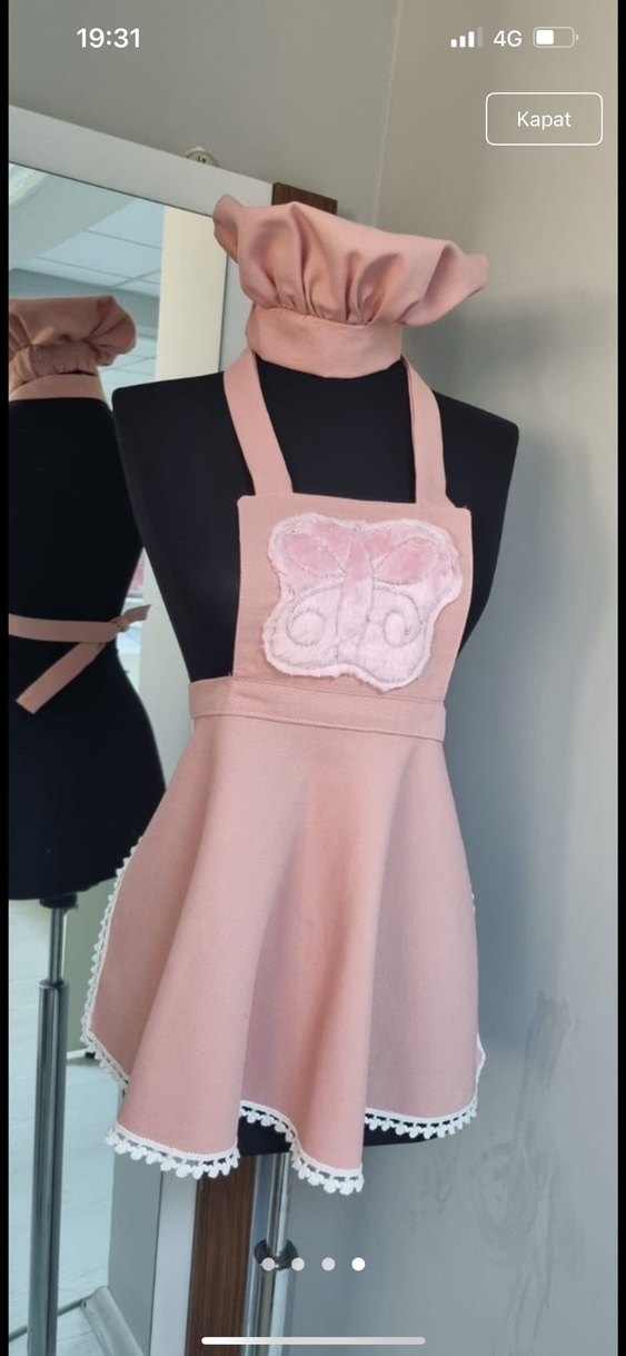 Pastel pembemsi mutfak önlüğü, göğüs kısmında nakışlı kelebek deseni ve yumuşak kumaş ile birlikte şapka içerir.