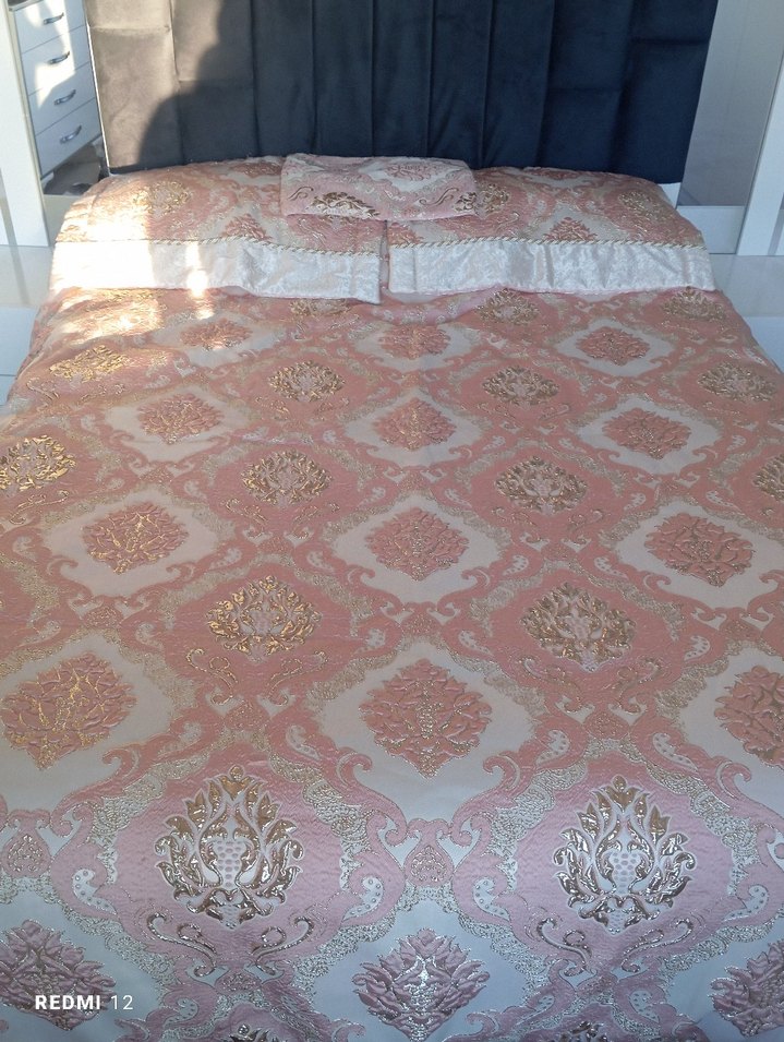 Yatak odasına yumuşak ve şık bir dokunuş katan nakışlı desenlere sahip pastel pembe yatak örtüsü. Uyumu sağlayan yastık kılıfları dahildir. ️ ürünün görünmeyen kısmı gorseldeki gibiı hafif defoludur