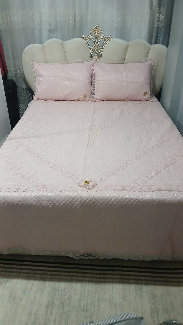 Yumuşak pastel pembe tonlarda, ince nakış detaylı çift kişilik yatak örtüsü ve uyumlu yastık kılıflarından oluşan set. Yatak odasına zarif bir dokunuş katar. Sıfır ürün görsel için serildi