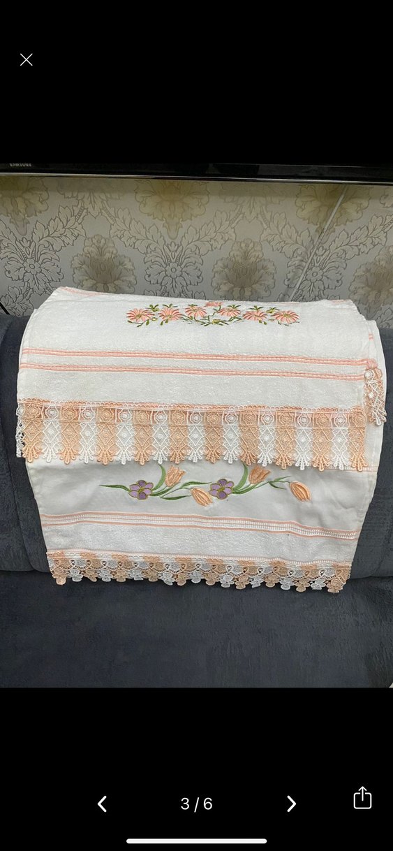 Pastel renklerde işlemeli çiçek desenleri ve narin dantel kenarları olan beyaz havlu, klasik ve zarif bir görünüm sunar.