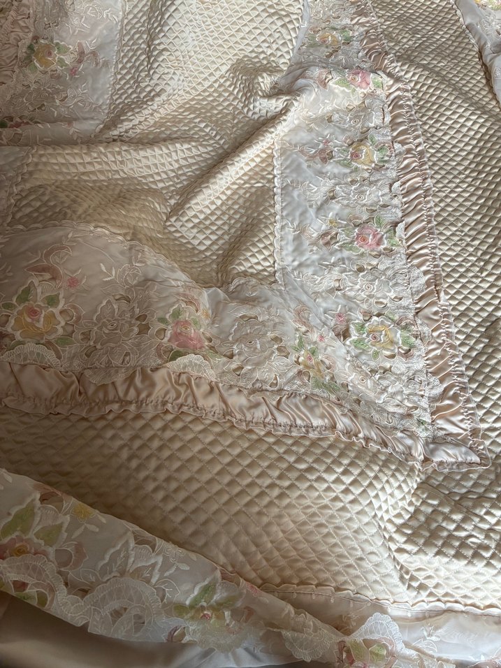 Nakışlı ve pastel renk detaylı beyaz yatak örtüsü, yumuşak ve zarif bir görünüm sunar. ️