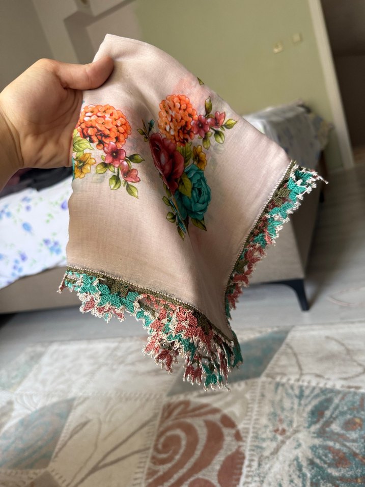 Nakışlı çiçek desenleri ve ince dantel kenarlarıyla pastel renklerde bohem kadın fularıdır. Retro ve hippie tarzını yansıtır.