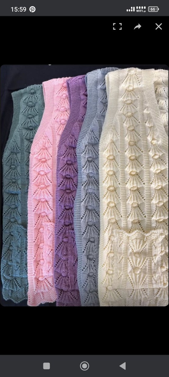 Nakışlı desenlere sahip, pastel tonlarda kızlar için kolsuz triko yelek. Normal kesim ve klasik tarzda.