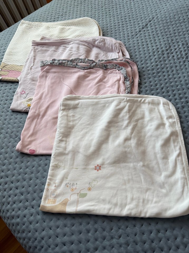 Yumuşak dokulu, pastel renklerde nakışlı çocuk battaniyeleri, nazik gri ve pembe tonlarında. ️