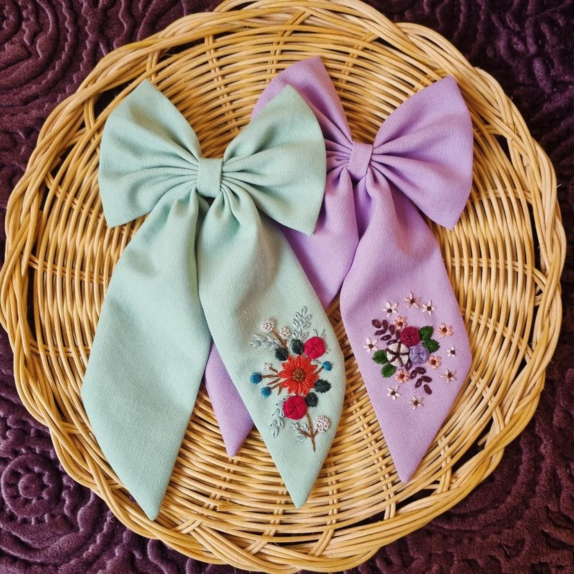 Nakışlı çiçek desenli, pastel mor ve yeşil tonlarında tekstil fiyonk saç aksesuarları. Vintage bohem tarzına uygun. Adet fiyatı 250 ₺.