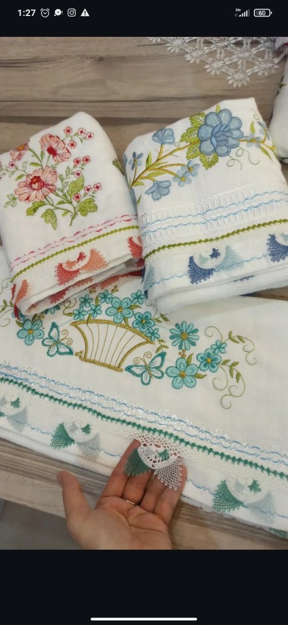 Nakışlı çiçek desenleri ve ince dantel kenarlarıyla pastel renklerde klasik tarzda havlu seti. Yumuşak ve dekoratif havlular.
