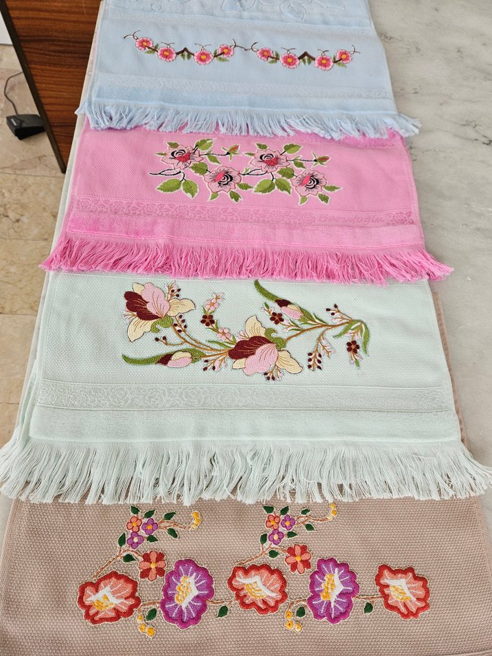 Pastel tonlarda, nakışlı çiçek desenleri ve püsküllü kenarları olan geleneksel tarzda havlu seti. Her havluda farklı bir motif bulunur.