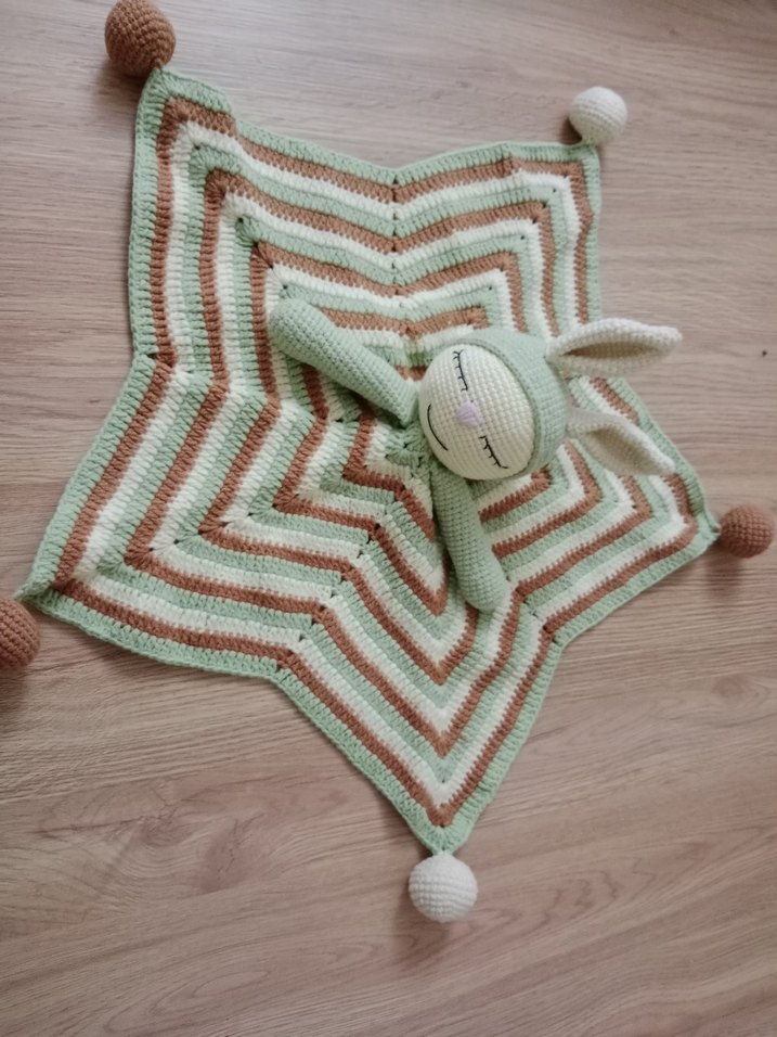 Pastel renklerde örgü çocuk battaniyesi, nakışlı detaylar ve ortasında yumuşak oyuncak tavşan figürü bulunur. Köşelerinde ponponlar vardır.