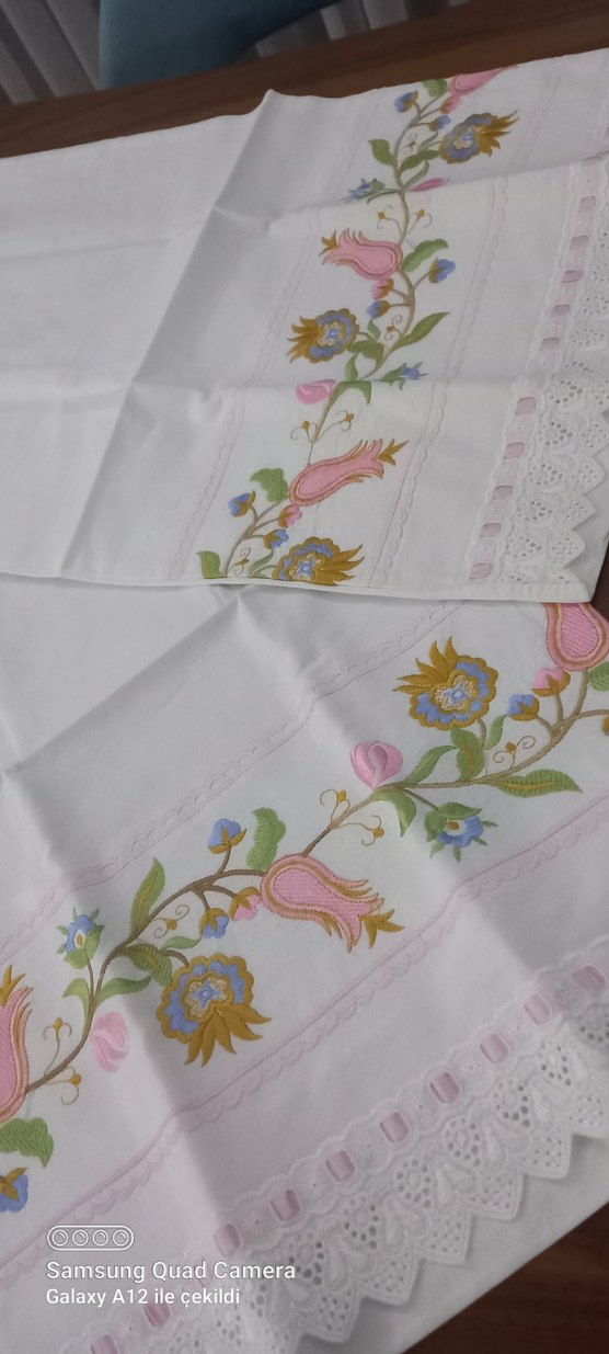 Bu geleneksel beyaz kumaş üzerinde pastel renkte zarif nakışlı çiçek desenlerine sahiptir, yumuşak ve şık bir dokunuş katar.