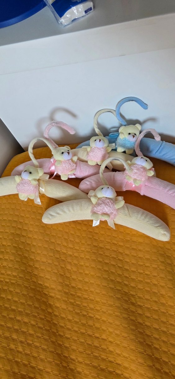 6 adet Pastel renklerde, yumuşak dokulu ve nakışlı ayıcık süslemeli çocuk askıları.