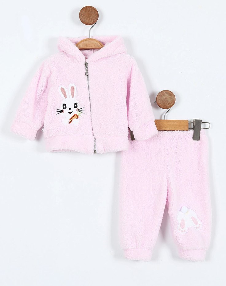 Pastel pembe renkli, peluş dokulu, uzun kollu ve kapüşonlu, üzerinde nakışlı tavşan figürü bulunan bebek takımı.