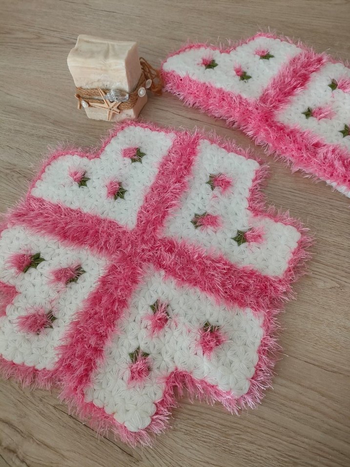 Renkli pembe nakışlı, yumuşak ve tüylü dokulu banyo lifleri, banyonuza sıcaklık katıyor. (2 adet).