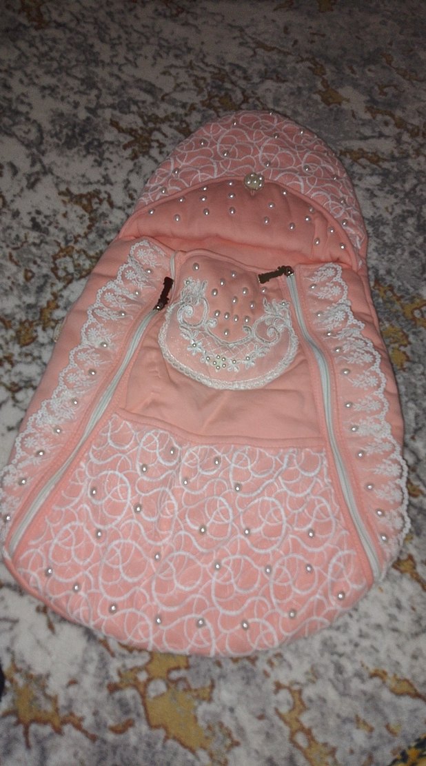 Nakışlı ve incili detaylara sahip pastel pembe bebek kucagi rahatlık ve şıklık sunar.