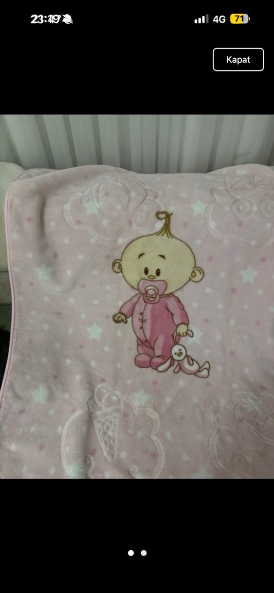 Pastel pembe renkte, nakışlı bebek figürlü, yumuşak ve sıcak kumaştan yapılmış çocuk battaniyesi. Rahat ve şirin detaylara sahip.