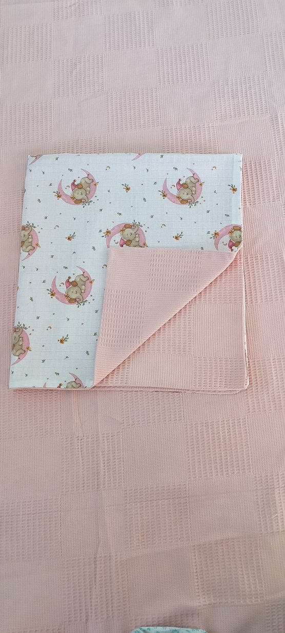 Bu çocuk battaniyesi, bir tarafında nakışlı ayıcık desenleri ve diğer tarafında dokulu pastel pembe renkte olan yumuşak sentetik kumaştan yapılmıştır.