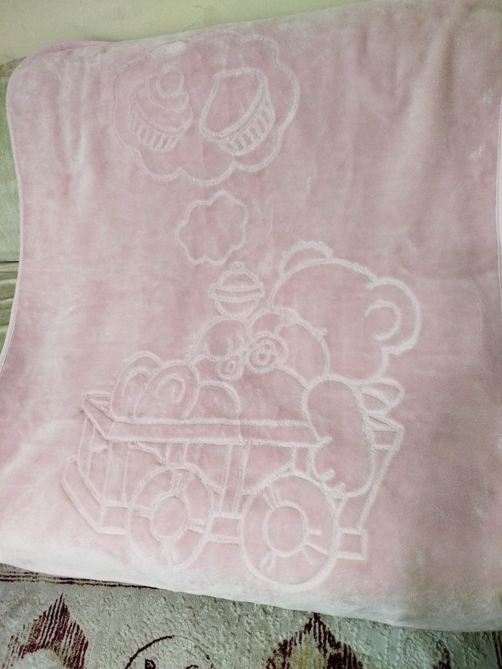 Yumuşak pembe renkte, nakışlı ayıcık desenli çocuk battaniyesi. Rahat ve sıcak tutan kumaştan yapılmıştır.
