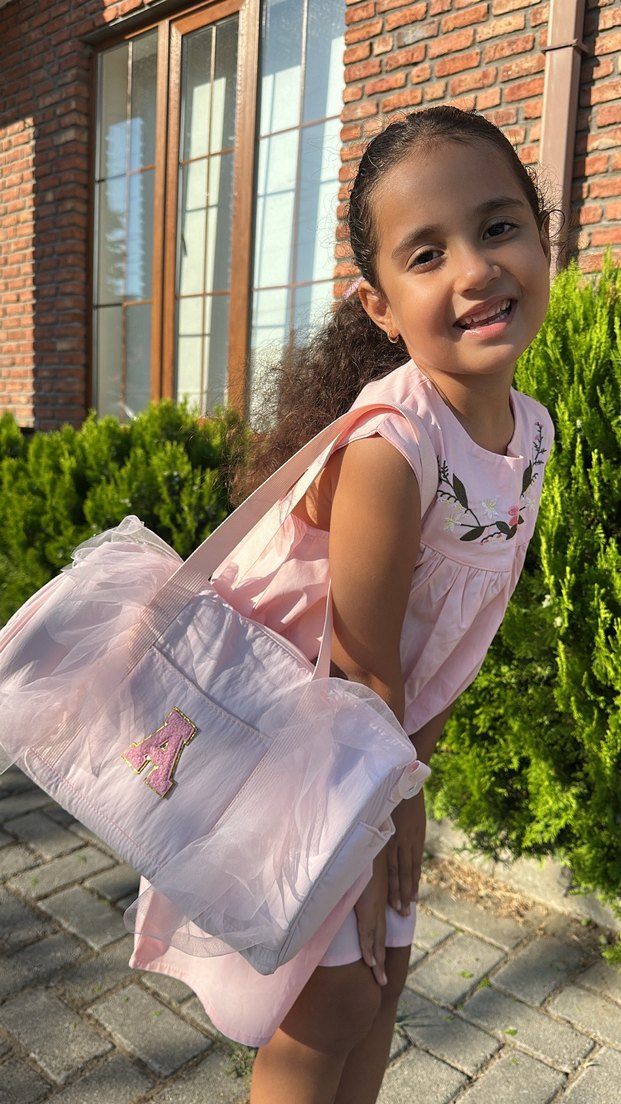Nakışlı detaylara sahip pastel pembe bebek çantası, yumuşak kumaş ve geniş iç hacim ile rahat taşıma sağlar. İthal etiketli üründür.
