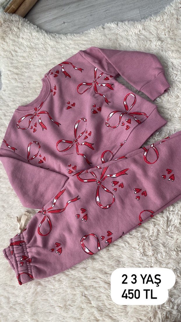 Pastel pembe renkte, uzun kollu, nakışlı fiyonk ve kalp desenli bebek kız takımı. 2-3 yaş için uygundur.