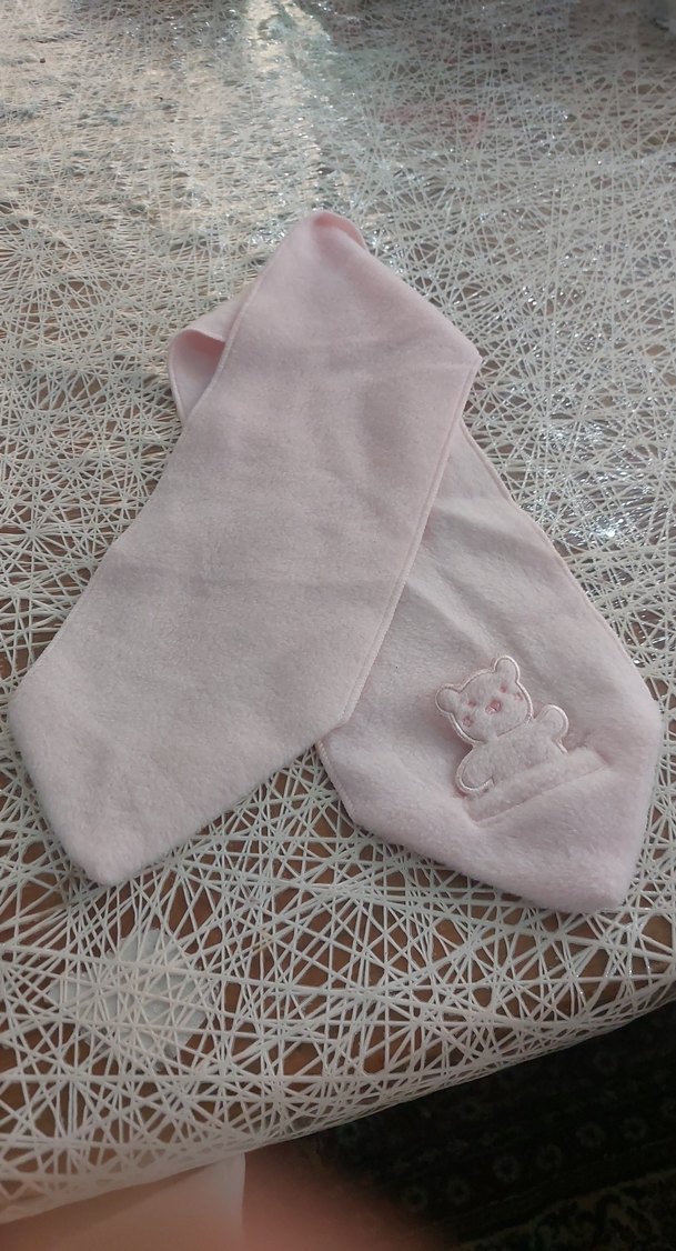 Pastel pembe renkte, nakışlı ayıcık desenli, yumuşak kumaştan yapılmış bebek atki