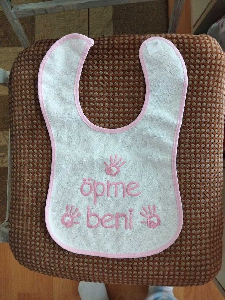 Nakışlı pembe bebek önlüğü, 'öpme beni' yazılı ve el baskılı detaylar içerir. Yumuşak kumaşlı, cırt cırtlı kapanışlı.