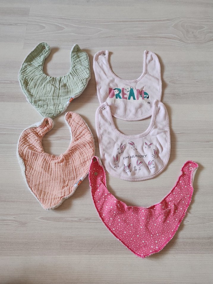 Nakışlı desenlere sahip pastel tonlarda pembe ve diğer yumuşak renklerde bebek önlükleri. Rahat ve şık bebekler için.