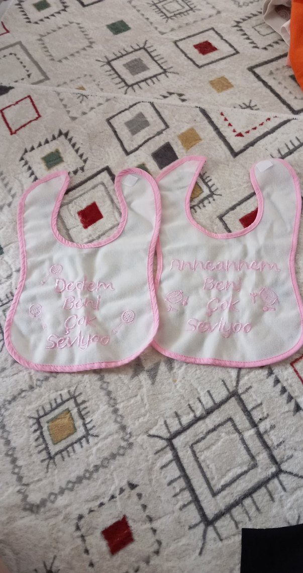 Pastel pembe renkte, nakışlı yazılar ve desenlerle süslenmiş iki adet bebek önlüğü seti. Yumuşak kenarlara ve kolay kapanmaya sahiptir.