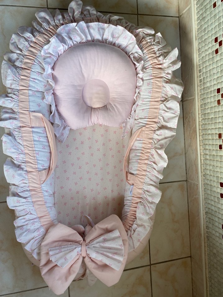 Nakışlı detaylara sahip pastel pembe bebek uyku yatağı, yumuşak sentetik kumaştan, büyük dekoratif fiyonk ile rahat uyku sağlar.