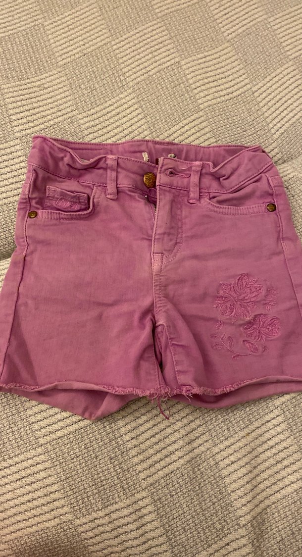 Düğmeli, nakışlı çiçek detaylı, bol kesim pembe denim şort, bohem tarzı yansıtıyor.