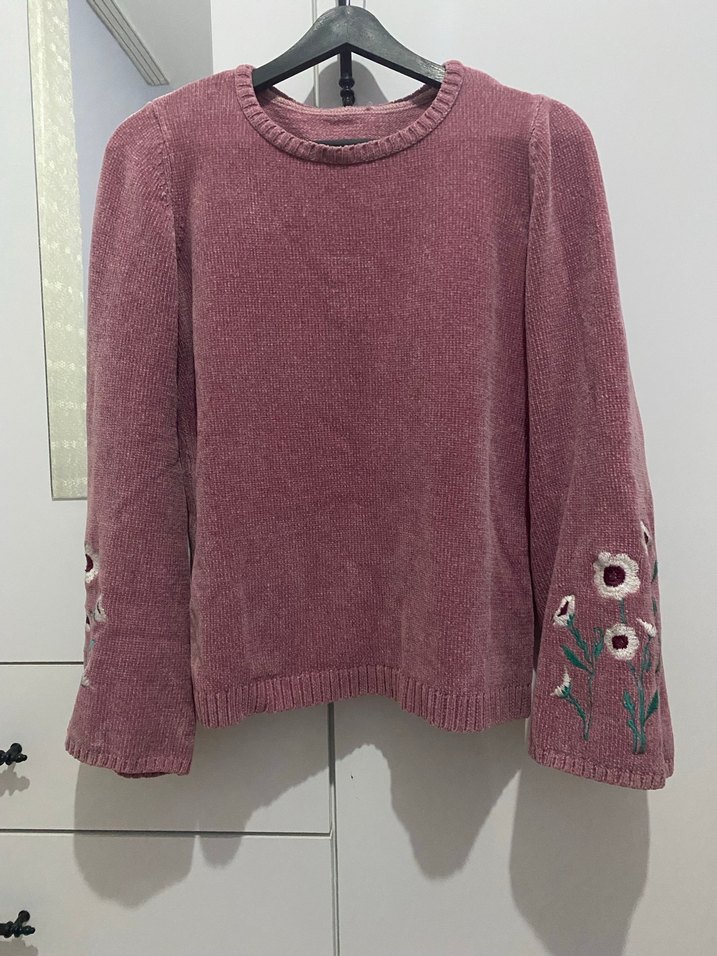Pembe renkli, nakışlı çiçek desenli kolları olan uzun kollu, rahat kesim bohem kadın kazak.