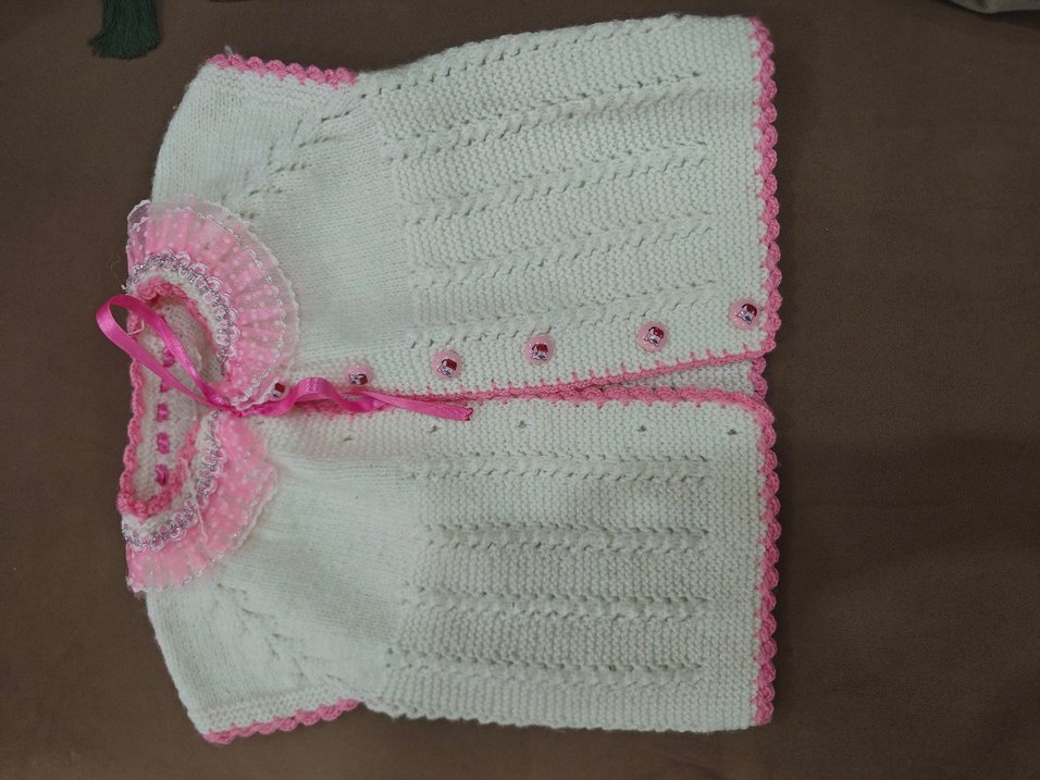 Fitted kesim, kolsuz kız triko yelek, nakışlı detaylar ve pastel pembe renkte. Bohem tarzda, düğmeli ve fırfırlı kenarları vardır.