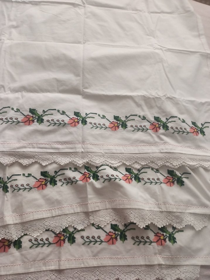 Pastel pembe renkli, nakış işlemeli ve dantel detaylı bohem tarzda masa örtüsü, masanıza yumuşak ve sanatsal bir dokunuş katar.