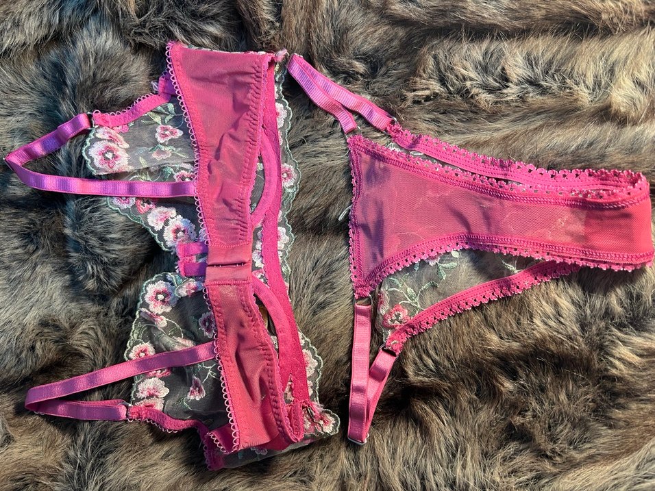 Koyu pembe bohem tarzda, nakışlı çiçek desenli sütyen ve külot takımı. Ayarlanabilir askılar ve ince detaylarla midi uzunluğunda.