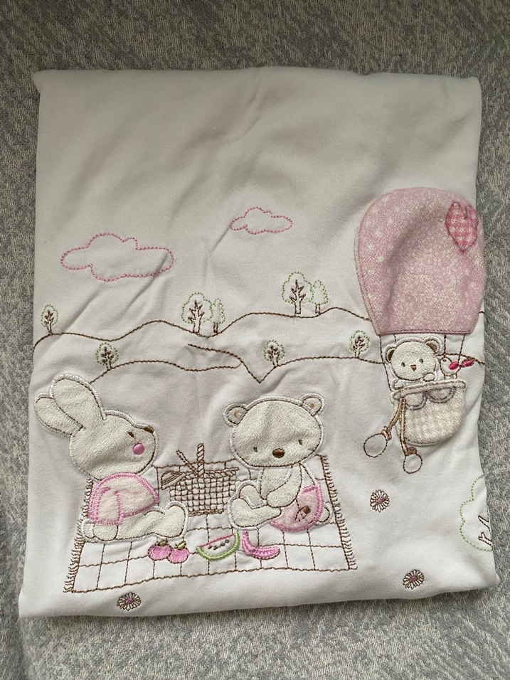 Pastel pembe renkli çocuk battaniyesi, hayvanlar ve sıcak hava balonu nakışlarıyla süslenmiştir.