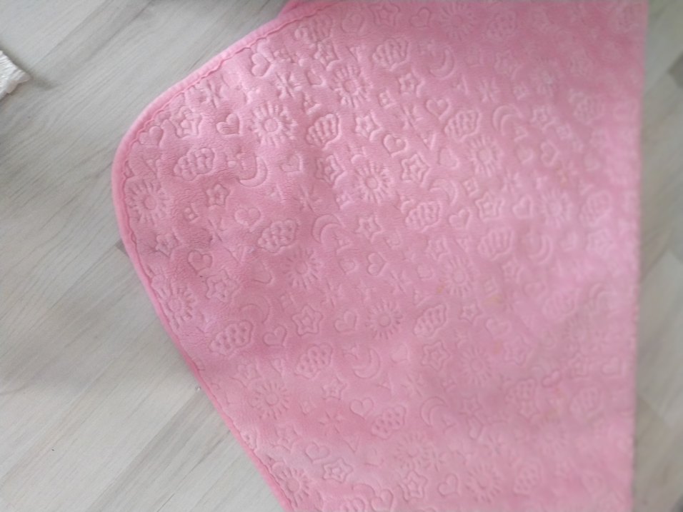 Pastel pembe renkte, nakışlı desenli, yumuşak ve sıcak dokulu çocuk battaniyesi.