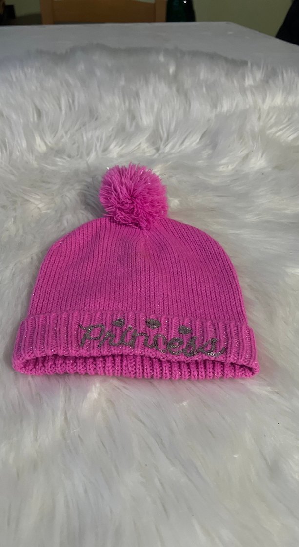 Pembe renkli, nakış detaylı ve ponponlu çocuk bere. Örgü kumaştan yapılmış, sade ve temel bir tarza sahip.