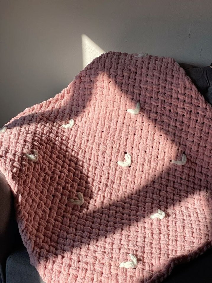 Pastel pembe renkte, nakışlı detaylara sahip örgü çocuk battaniyesi, yumuşak ve rahat bir dokunuş sunar.