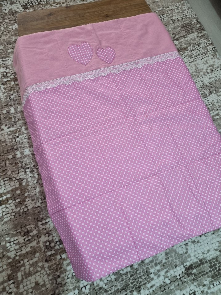 Nakışlı kalp desenleri ve dantel detaylı, yumuşak sentetik kumaştan yapılmış pastel pembe çocuk uyku örtüsü. ️ özel dikim yaptırdım hiç kullanılmadı. zaten fotografta da anlaşılıyor hiç kullanılmadığı.